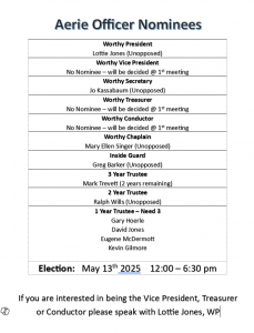 AERIE OFFICER ELECTIONS Calendar Add to Calendar Add to Timely Calendar Add to Google Add to Outlook Add to Apple Calendar Add to other calendar Export to XML When: May 13, 2025 @ 12:00 PM – 6:30 PM 2025-05-13T12:00:00+00:00 2025-05-13T18:30:00+00:00 Where: Weeki Wachee Eagles 8263 Cortez Boulevard Weeki Wachee, FL 34607 USA Contact: 352-597-1586 FOE 4372 Event